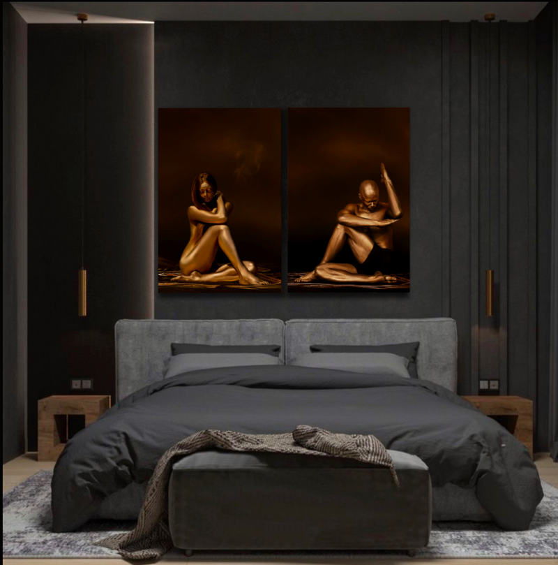 This diptych captures the serene strength of a golden-painted female and male yogi in meditative postures, embodying balance, spirituality, and divine union. Printed on museum-grade fine art paper, this artwork elevates any luxury space—perfect for five-star hotels, wellness resorts, spas, yoga studios, and sophisticated private collectors. The glowing golden bodies radiate sensuality and sacred stillness, merging fine art photography with spiritual symbolism. Also celebrated as LGBTQ-inclusive body art, this piece highlights the timeless beauty of both feminine and masculine energies in harmony.